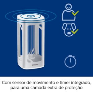 Como a exposição ao raios UV-C pode ferir olhos e pele, as luzes Philips UV-C adicionaram uma camada de proteção com sensores internos que detectam pessoas e animais
